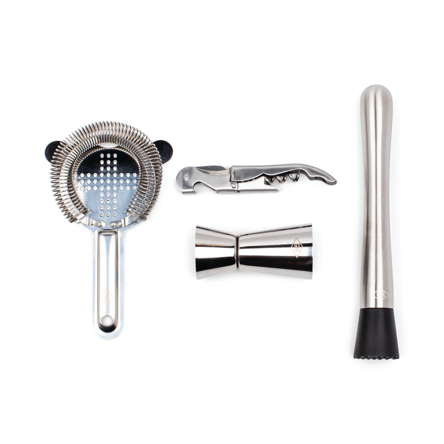 Un set completo per il professionista del cocktail. Include misurini da 50 e 25 ml, un colino da cocktail, un apribottiglie 4 in 1 e un pestello per cocktail, tutto l’essenziale per creare mix perfetti.